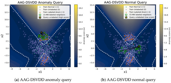 Finally, AAG-DSVDD also offers practitioners a practical way to obtain sample-level interpretation, which is important when most observations are unlabeled. Because the latent space has been shaped by the label-aware k-NN graph and its regularizer, nearby points with strong graph connections tend to share similar anomaly scores. A k-NN search in this space can therefore identify labeled neighbors for any unlabeled sample, whose labels and contextual descriptions provide an example-based interpretation of its anomaly score. In practice, this neighborhood inspection allows operators to see whether a high anomaly score is associated primarily with labeled anomalous patterns or with benign operating conditions, yielding a transparent, example-based explanation for each unlabeled sample.