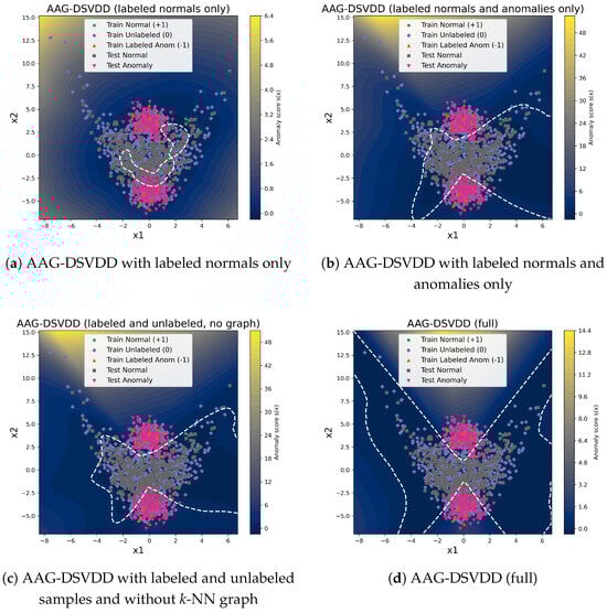 On the synthetic banana dataset, AAG-DSVDD consistently outperformed DeepSVDD, DeepSAD, OC-SVM, and SVDD-RBF. On the representative experiment, it achieved F1 and accuracy , compared with F1 and accuracy for the strongest classical baseline (SVDD-RBF) and F1 and accuracy for DeepSAD. Over ten seeds, AAG-DSVDD reached a mean F1 of versus for SVDD-RBF and for OC-SVM, with all gains statistically significant under paired tests. An ablation study on the same dataset confirms that each component of the objective contributes to performance. Starting from F1 with labeled normals only, adding labeled anomalies raises F1 to , incorporating the unlabeled center-pull term yields F1 , and the full model with graph regularization reaches F1 with the highest precision and accuracy among all variants.