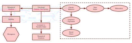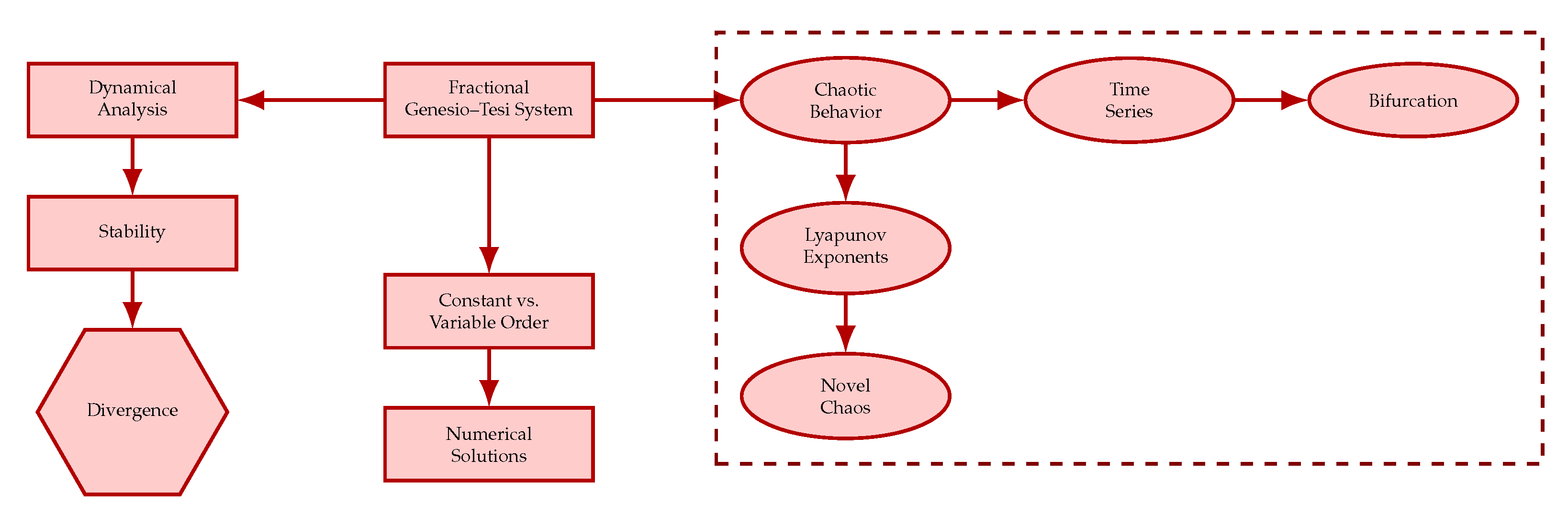 Figure 1 abstract summarizes the key components of the fractional-order Genesio–Tesi system analysis in this paper. In particular, the central model is analyzed by means of dynamical analysis, investigation of stability, and divergence behavior to provide insight into how fractional dynamics affect the evolution of the system. We have conducted a comparison between constant-order and variable-order formulations, focusing on their influence on numerical solutions and transient responses. In general, from a chaotic perspective, the approach utilizes time series, bifurcation diagrams, and Lyapunov exponents to identify regions of instability and to quantify the complexity of the system. It follows that new patterns of chaos appear, driven by variable-order effects, and in-depth insight into the system’s ability to switch from stable to highly irregular states is attained. Altogether, the scheme in this figure reflects how the use of fractional-order modeling improves understanding of nonlinear behavior within the Genesio–Tesi system and its potential applications to wider chaotic dynamics.