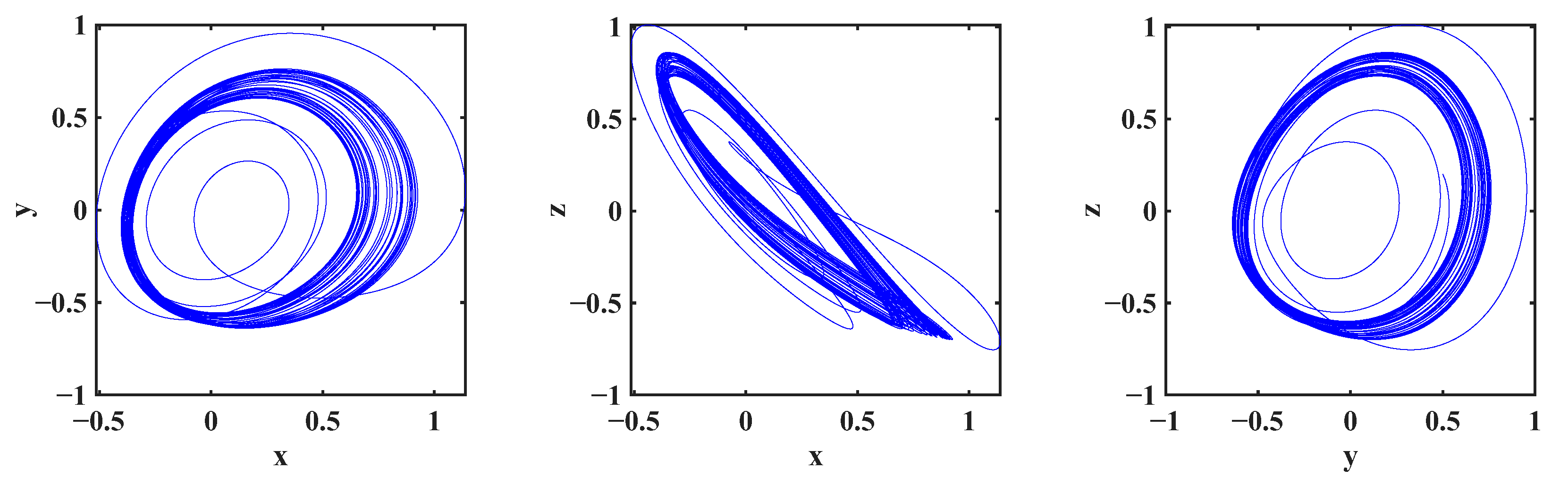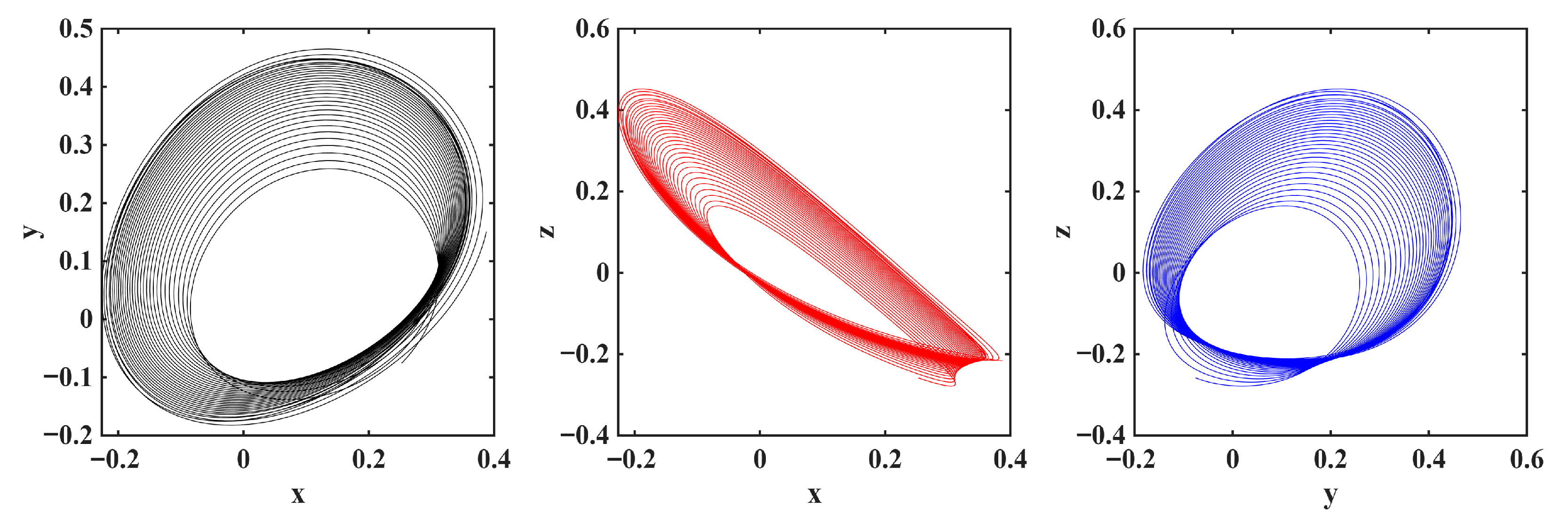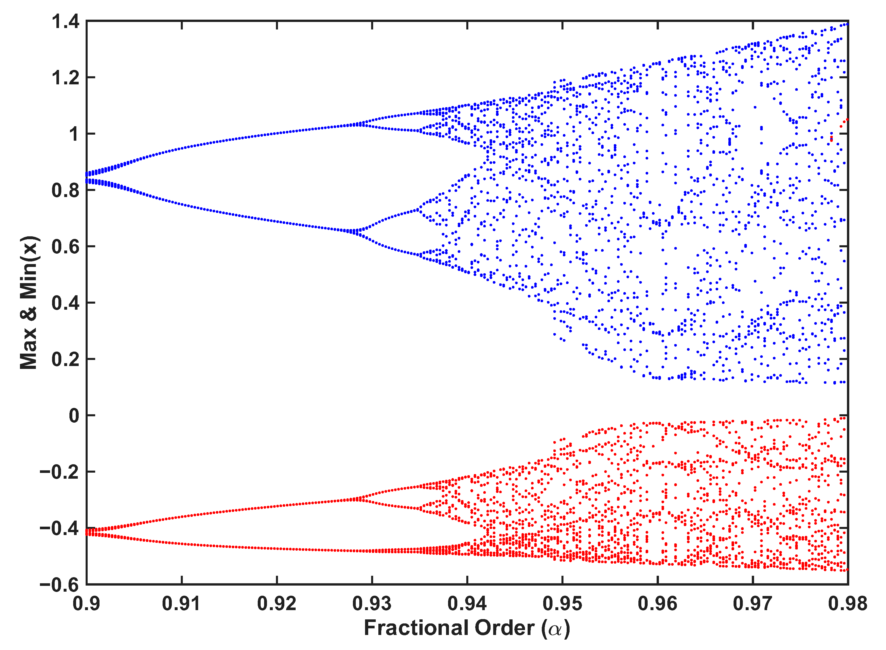 For values of beyond approximately , the diagram fills up rapidly, and points along both the blue and red branches become very scattered. Such a structure is typical for chaotic attractors and thus verifies that the system becomes fully chaotic. Convergence to periodic cycles does not occur in this range, but trajectories exhibit a strong sensitivity with respect to variations in the parameter and initial conditions. Overlapping clusters bear evidence for various coexisting oscillatory modes, as usually happens in fractional-order nonlinear systems.