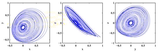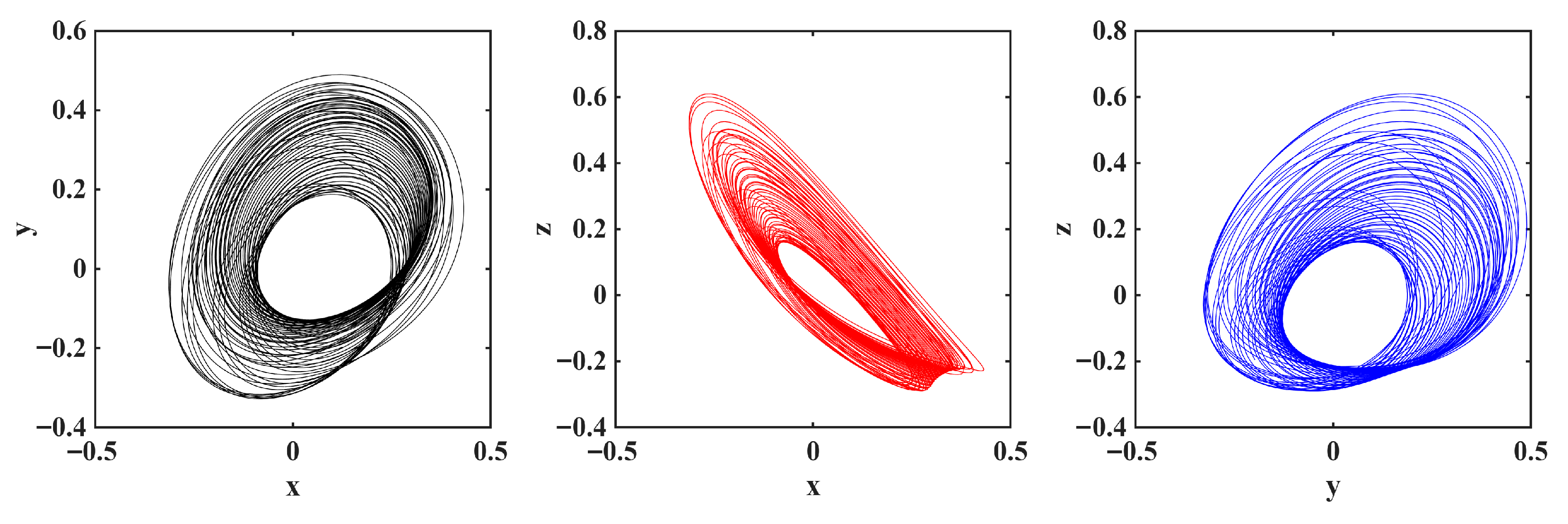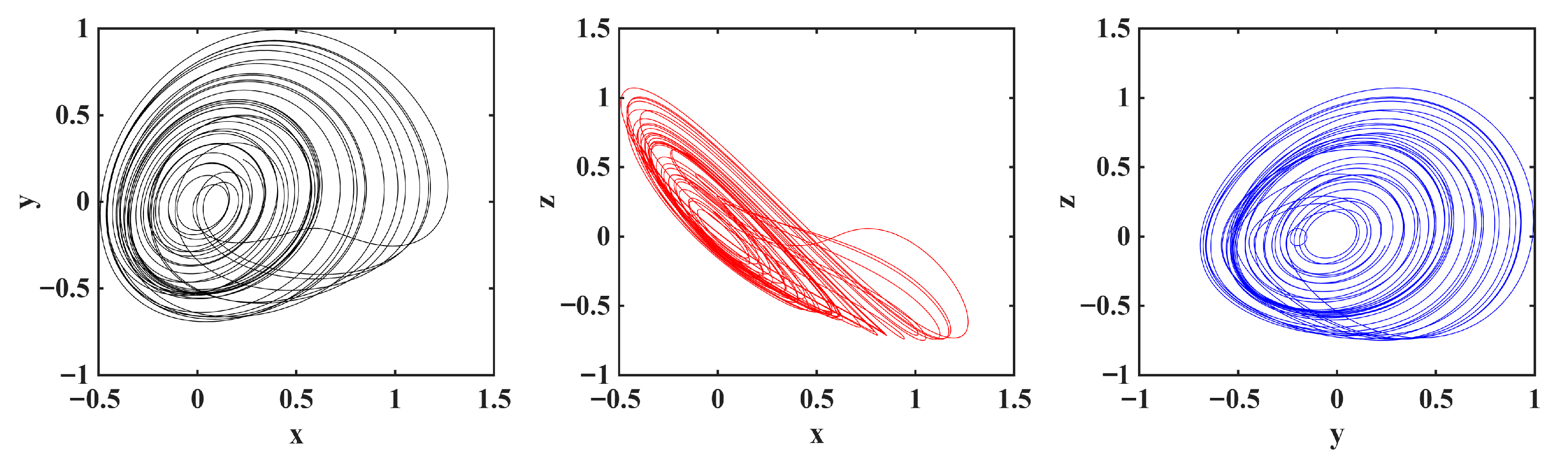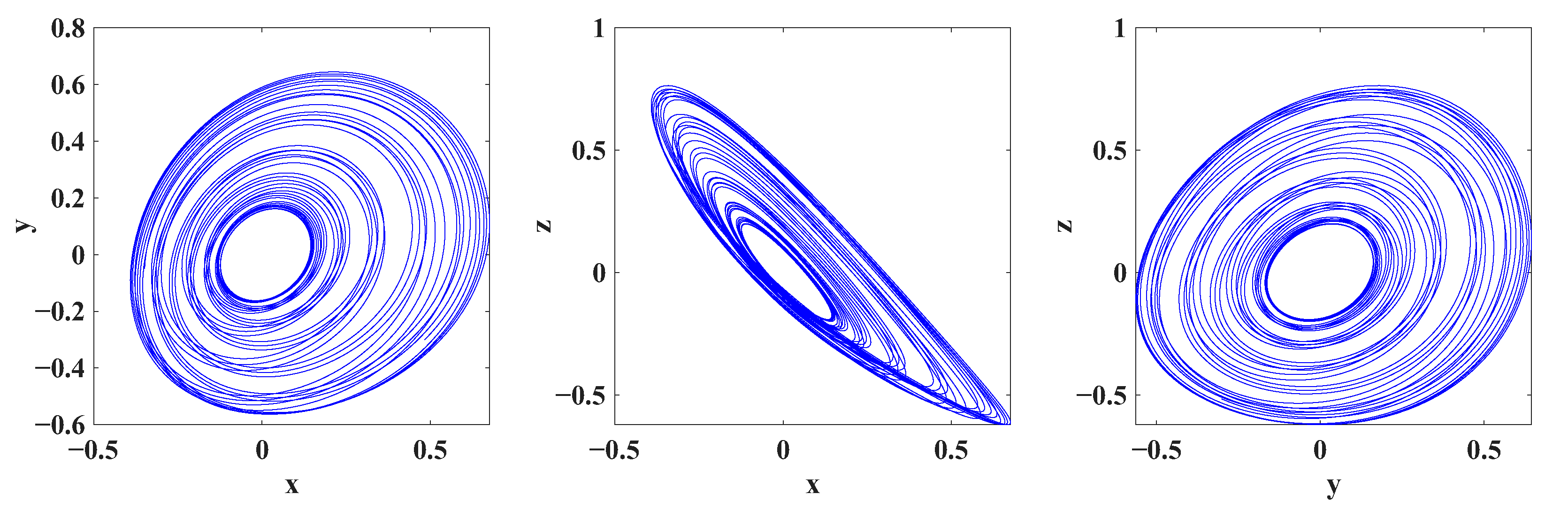 For values of beyond approximately , the diagram fills up rapidly, and points along both the blue and red branches become very scattered. Such a structure is typical for chaotic attractors and thus verifies that the system becomes fully chaotic. Convergence to periodic cycles does not occur in this range, but trajectories exhibit a strong sensitivity with respect to variations in the parameter and initial conditions. Overlapping clusters bear evidence for various coexisting oscillatory modes, as usually happens in fractional-order nonlinear systems.