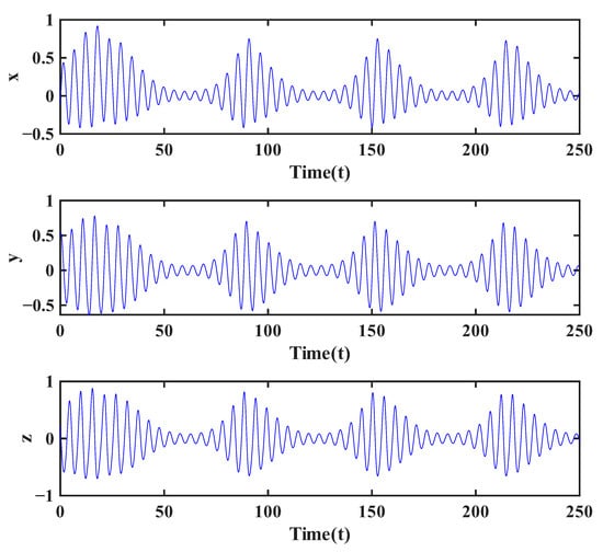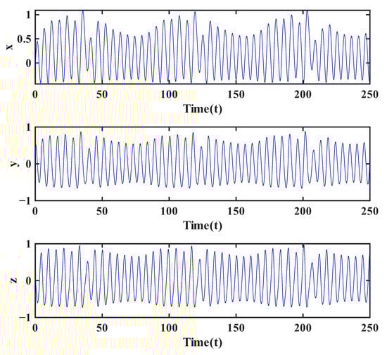 In this section, we consider the variable-order cases in the following form to demonstrate three kinds of realistic memory behavior in fractional dynamical systems: Case 1: , Case 2: , and Case 3: . It can be seen that the first two cases add smooth periodic changes to the fractional order, which allows the system to switch slowly between areas of weaker and stronger memory. This models the oscillatory environments or cyclic influences that are often encountered. Case 1 uses a cosine modulation for symmetric changes around the mean, while Case 2 uses a sine modulation with just a bit higher amplitude to test the sensitivity to periodic perturbations with phase shift. Case 3 utilizes a hyperbolic tangent function to introduce a nonperiodic transition of the fractional order. The functions modeled by such a hyperbolic tangent are similar to those including memory variation from one regime to another, as in adaptation or learning, or the accumulation of long-term processes. This technique allows the full evaluation of different types of variable-order law influences, such as periodic, phase-shifted, and transitional, on stability, divergence, and chaotic dynamics onset in the fractional Genesio–Tesi system.