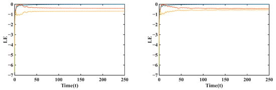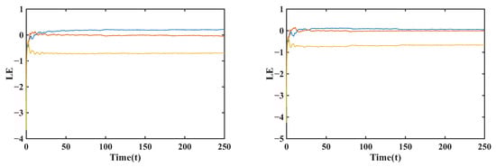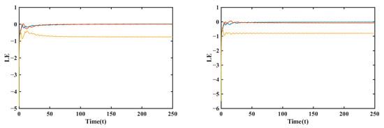 Figure 19, Lyapunov exponent (LE) time series are used to evaluate the effect of time-varying versus constant fractional orders on the stability of the system. For all the cases studied—namely
