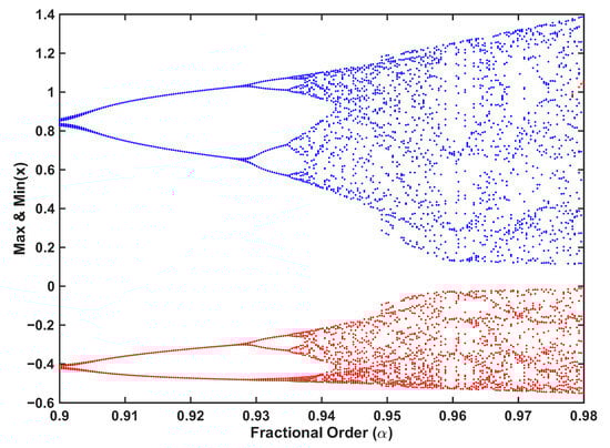 For values of close to , the system has a stable periodic orbit where maxima and minima collapse into single branches, indicating low sensitivity to initial conditions and dominance of stable limit-cycle behavior. Increasing toward approximately , the branches start to split. This splitting of branches signals the onset of a period-doubling cascade. Successive doublings are a classical route to chaos and reflect the gradual loss of stability as the memory effect—controlled by the fractional order—becomes weaker.