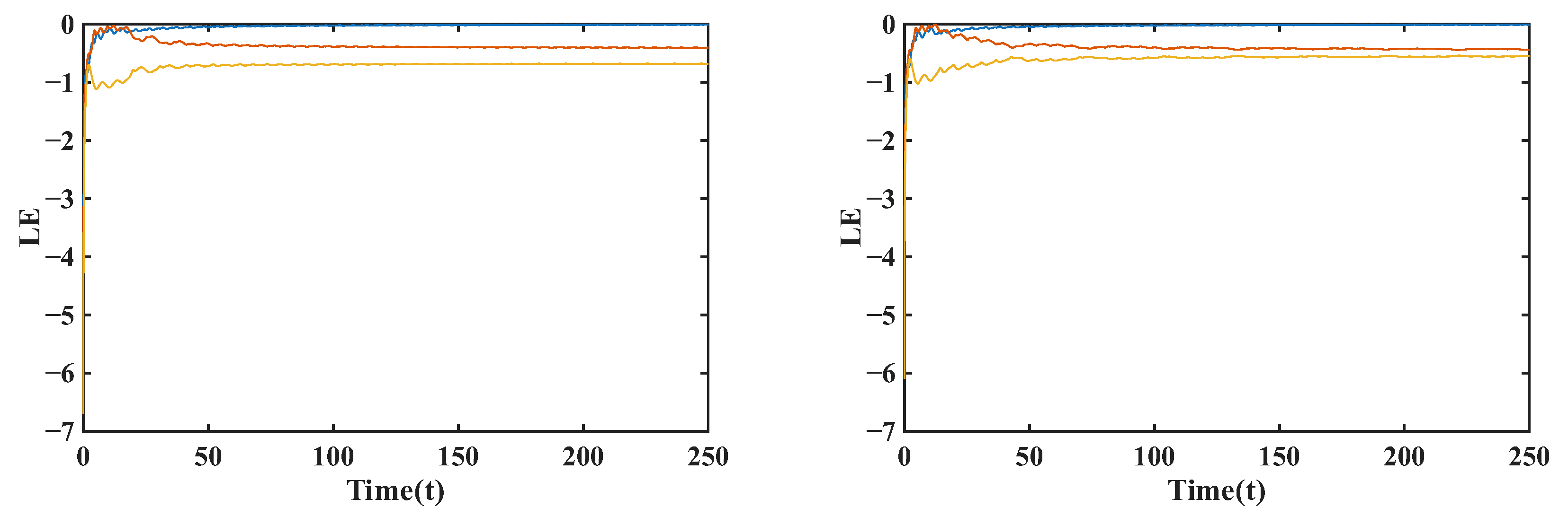 Thus, in the constant-order model, the use of Matignon’s stability criterion provides a clear, analytical threshold for the onset of instability. For constant fractional order, necessary and sufficient conditions for local asymptotic stability are provided by the spectrum of eigenvalues of the Jacobian matrix. As a matter of fact, for either decreasing fractional order or system parameters out of the stability domain, the theoretical prediction agrees well with numerical simulations, supported by all the phase portraits and the sign of the largest Lyapunov exponent, confirming the transition toward oscillatory or chaotic behavior. Therefore, for the constant-order formulation, stability regions can be identified both analytically and numerically.