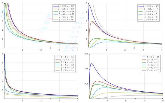 In continuation, we present a few graphs (Figure 1) of the density function defined by Equation (2) for a range of values of parameters and . Each plot contains four curves for selected values of and . Here one can appreciate the vast varieties of shapes that emerge from the inverted Topp–Leone distribution.