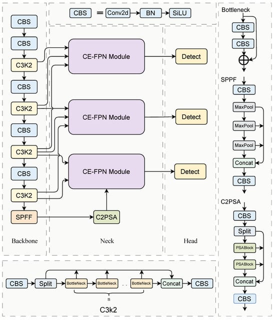 The proposed object detection framework is based on the YOLO11 architecture, in which the original neck component is replaced by the proposed CE-FPN module. The overall network consists of three primary stages: a backbone for hierarchical feature extraction, the CE-FPN neck for contrast-guided multi-scale feature refinement, and a detection head for object classification and localization. The overall architecture is illustrated in Figure 1.
