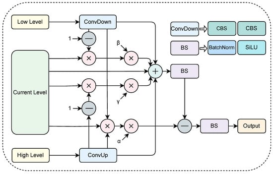 Let x, y, and z denote the high-level, mid-level, and low-level feature maps extracted from the backbone (e.g., YOLO11’s C5, C4, and C3 layers), with corresponding channel dimensions C1, C2, and C3. These features represent different levels of abstraction:
