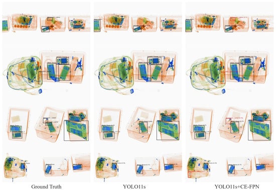 Table 2 compares the baseline YOLO11 model with its CE-FPN-enhanced variant. The proposed CE-FPN yields a clear improvement in overall mAP@50, increasing from 85.5% to 87.1%. The most notable gain occurs in the challenging Nonmetallic_Lighter class (+10.1 mAP@50), which contains small and low-contrast objects that are easily obscured in X-ray imagery. This substantial improvement highlights CE-FPN’s effectiveness in strengthening discriminative cues for visually ambiguous targets. Moderate gains are also observed for Tablet and Cosmetic, while performance on large, easily detectable categories (e.g., Laptop, Portable_Charger) remains stable, confirming that CE-FPN does not degrade performance on simpler cases.