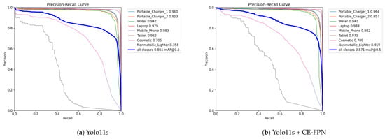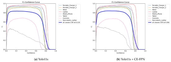 Figure 5 compares the F1–confidence curves of the baseline YOLO11s and our CE-FPN-enhanced model. The CE-FPN variant consistently achieves higher F1 scores across a wide confidence range, improving the optimal all-class F1 from 0.84 @ 0.218 (baseline) to 0.84 @ 0.266. This shift indicates that the enhanced model maintains stronger precision–recall balance at higher confidence thresholds. Notably, the Nonmetallic_Lighter class—characterized by extremely low contrast and small object size—shows a visibly more stable F1 curve, reflecting improved robustness in detecting weak-visibility objects. These results further validate that CE-FPN strengthens small-object discrimination while suppressing confidence-sensitive fluctuations.