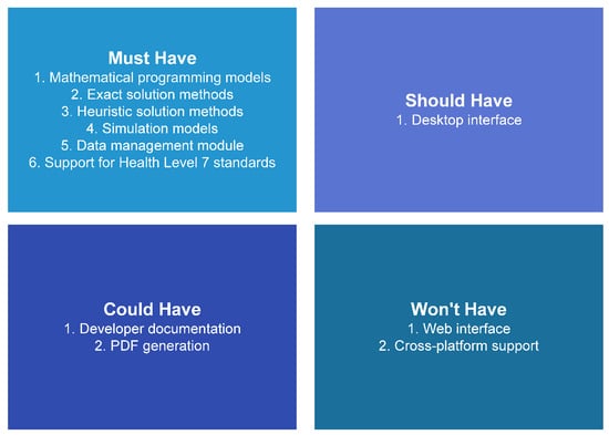 As shown in Figure 4, MoSCoW analysis (must have, should have, could have, and will not have) is used to prioritize the requirements of the system.
