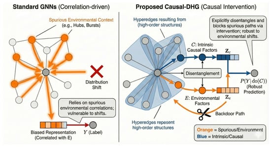 Motivating comparison between correlation-based GNNs and Causal-DHG. (Left): Standard GNNs aggregate neighbor information indiscriminately and tend to rely on environment-driven structural patterns, such as high-degree hubs or temporally concentrated bursts, which may be spuriously correlated with fraud labels. (Right): The proposed Causal-DHG disentangles intrinsic causal factors from environment-related factors and performs backdoor-style intervention to block spurious environmental paths, yielding representations that are more robust under distribution shifts.