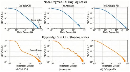 To avoid any label-dependent bias or artificial homophily, all hypergraph construction rules are strictly label-agnostic: hyperedges are defined only from publicly released identifiers and metadata that are also available at inference time (such as user and item IDs, emergency-contact edges, contact-type codes, and discretized timestamps), without using fraud labels or manually engineered “suspicious” patterns. Although the concrete grouping rules differ across YelpChi, Amazon, and DGraph-Fin due to their heterogeneous graph schemas (review-centric graphs versus user–contact networks), they follow the same principle of connecting nodes that share observable context in the original benchmarks. Structural statistics of the three benchmarks are summarized in Figure 3.