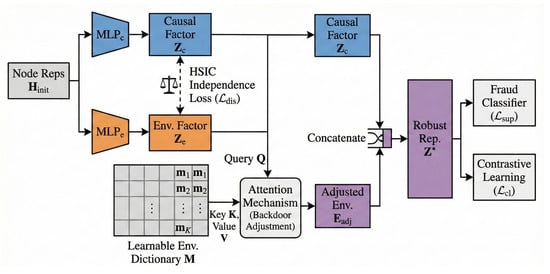 - A Causal Disentanglement Module that decomposes node representations into intrinsic causal and environment-related factors, enforces their independence via HSIC, and applies a dictionary-based backdoor adjustment mechanism to approximate the interventional distribution and suppress spurious environmental correlations.