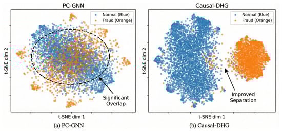 As shown in Figure 5, the embeddings produced by Causal-DHG exhibit clearer separation between fraudulent and benign nodes compared to PC-GNN, consistent with the quantitative improvements in AUC and F1-Macro.