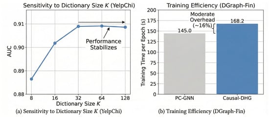 Model analysis. (a) AUC on YelpChi as a function of dictionary size K; performance improves as K increases from 8 to 32 and stabilizes thereafter. (b) Training time per epoch on DGraph-Fin for PC-GNN and Causal-DHG, showing that Causal-DHG incurs only a moderate overhead relative to PC-GNN while providing stronger robustness. The arrow indicates performance trend only and does not encode additional information.