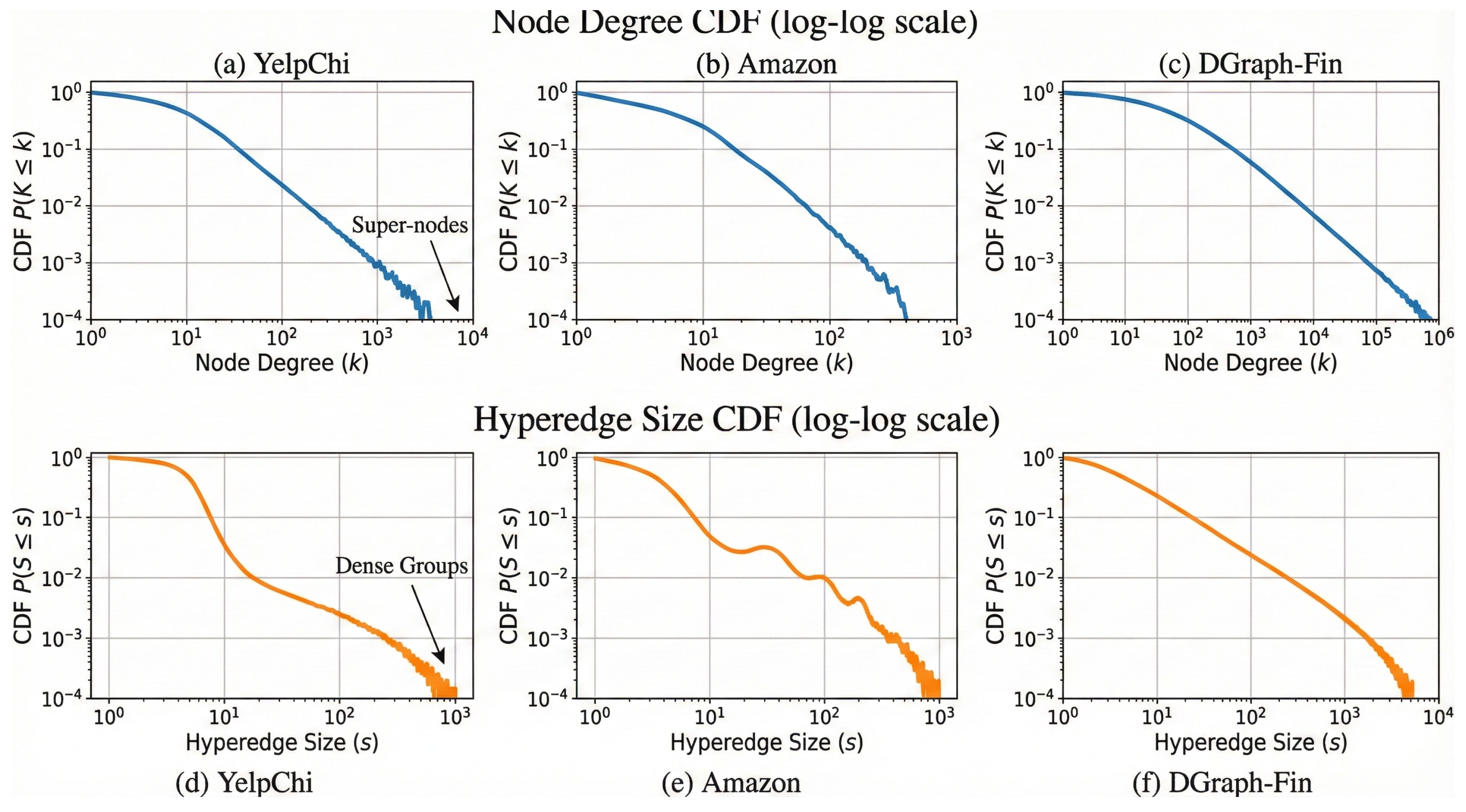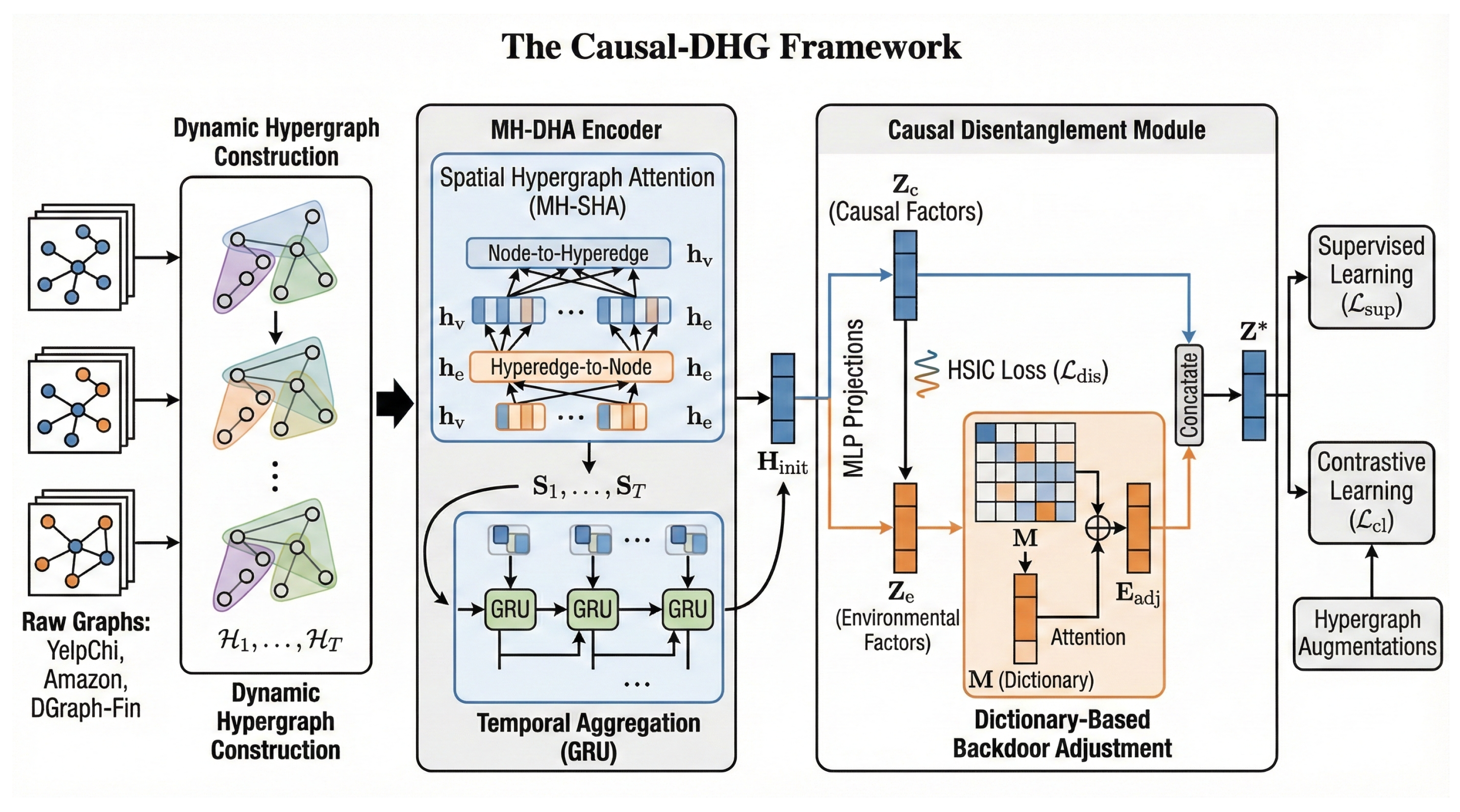 - A causality-aware dynamic hypergraph framework that captures high-order group interactions in realistic financial graphs (review networks and contact networks), with hypergraphs constructed directly from observed structures and attributes in YelpChi, Amazon, and DGraph-Fin.
