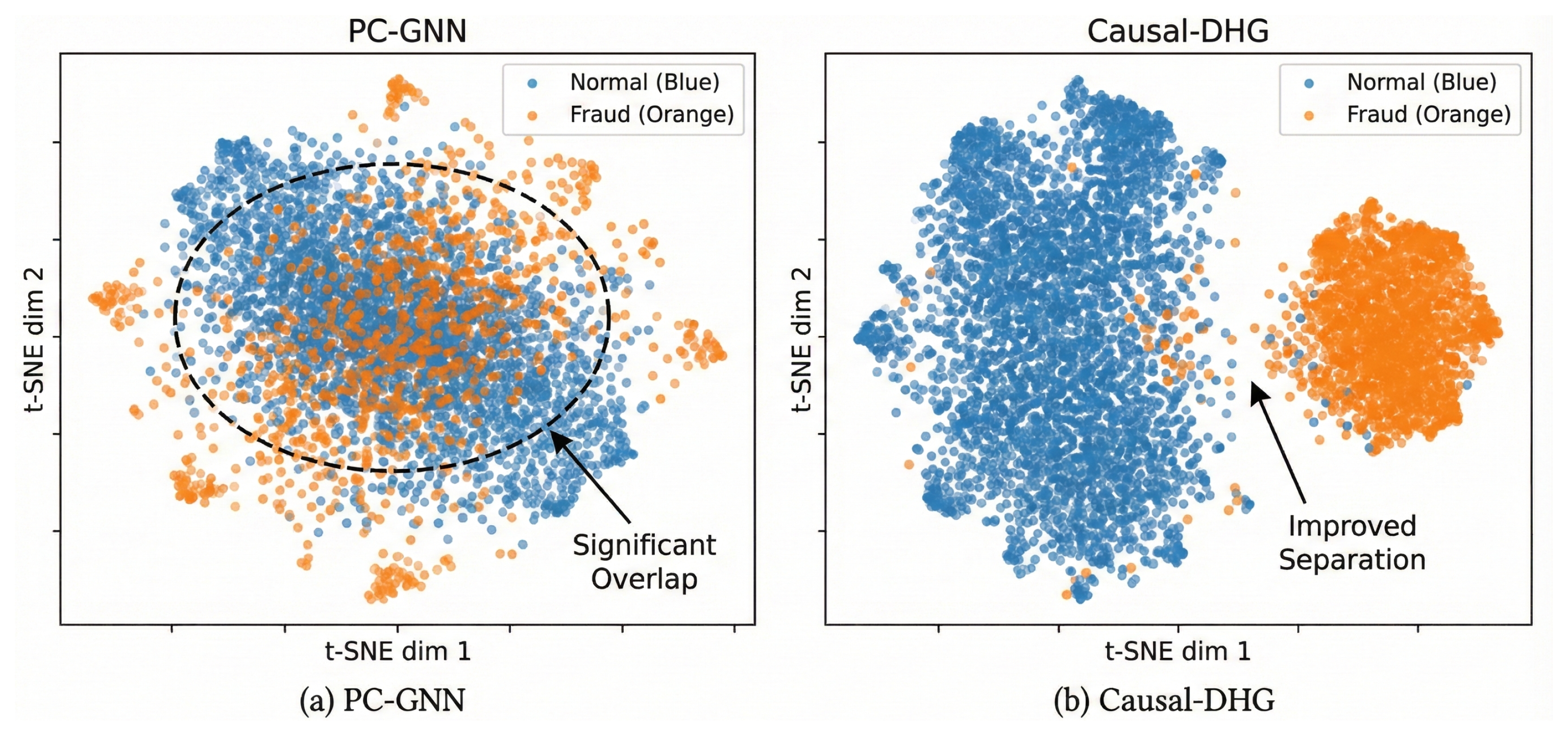 - Extensive experiments on YelpChi, Amazon, and DGraph-Fin show consistent improvements over strong baselines such as CARE-GNN and PC-GNN (up to about four percentage points in AUC) and demonstrate that the causal module substantially mitigates performance degradation under feature perturbations and structural noise.
