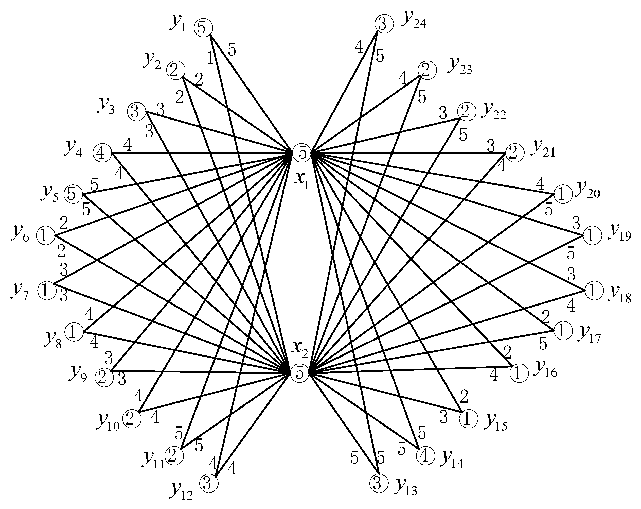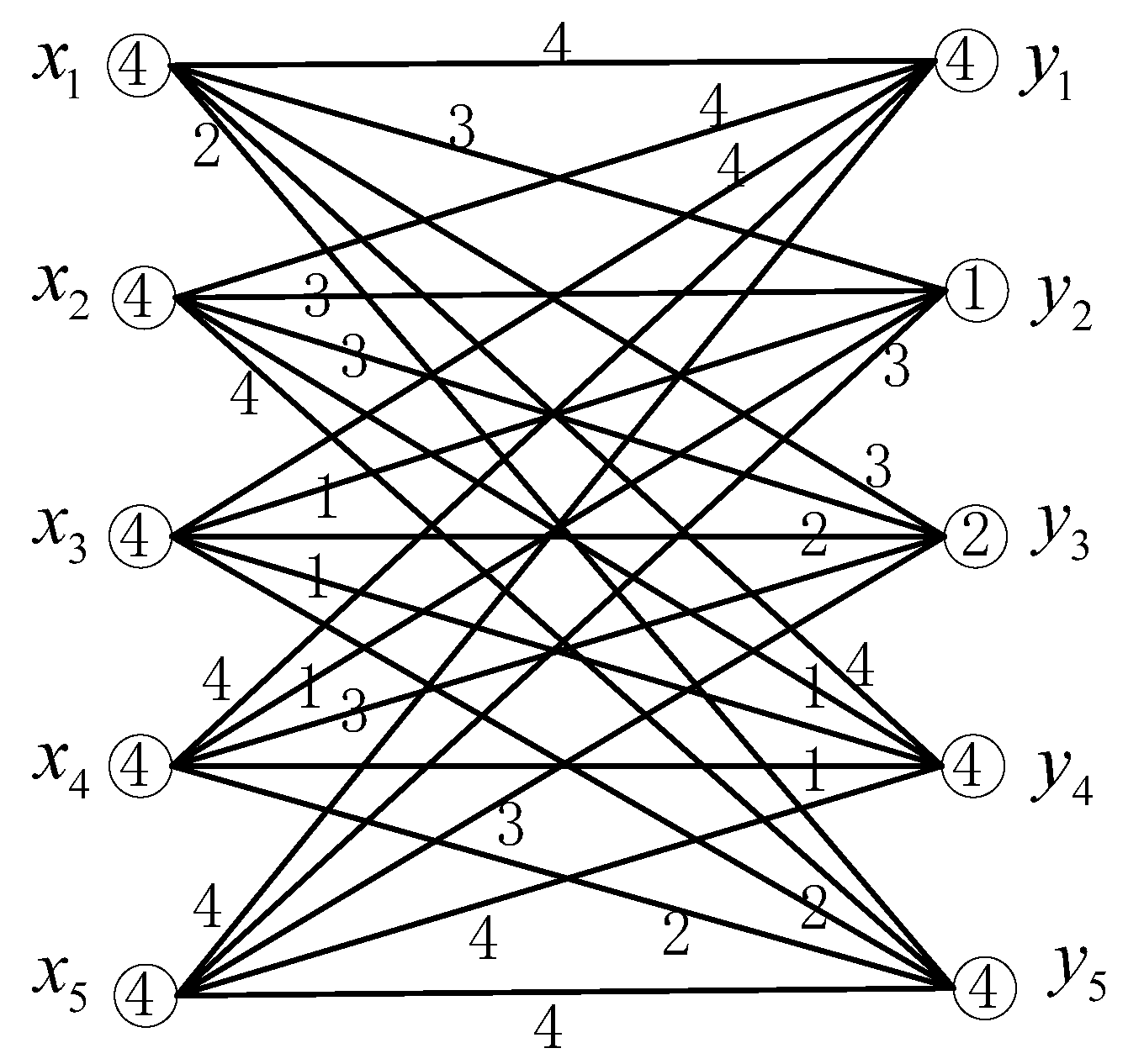 For complete bipartite graph (), we suppose that the vertex set of is , where , and the edge set of is .
