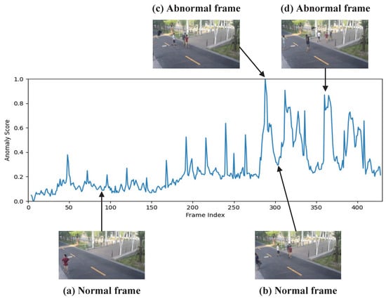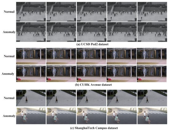 - UCSD ped2 Dataset. The UCSD ped2 dataset was recorded on the pedestrian walkways of the University of California San Diego. Sample cases are illustrated in Figure 6a. In this dataset, walking is defined as normal behavior, while activities such as cycling and skateboarding are considered anomalies. It contains 16 training videos and 12 testing videos. In experiments, the training videos are extracted into 2550 frames, while the testing videos are extracted into 2010 frames, all with a resolution of 240 × 360 pixels.