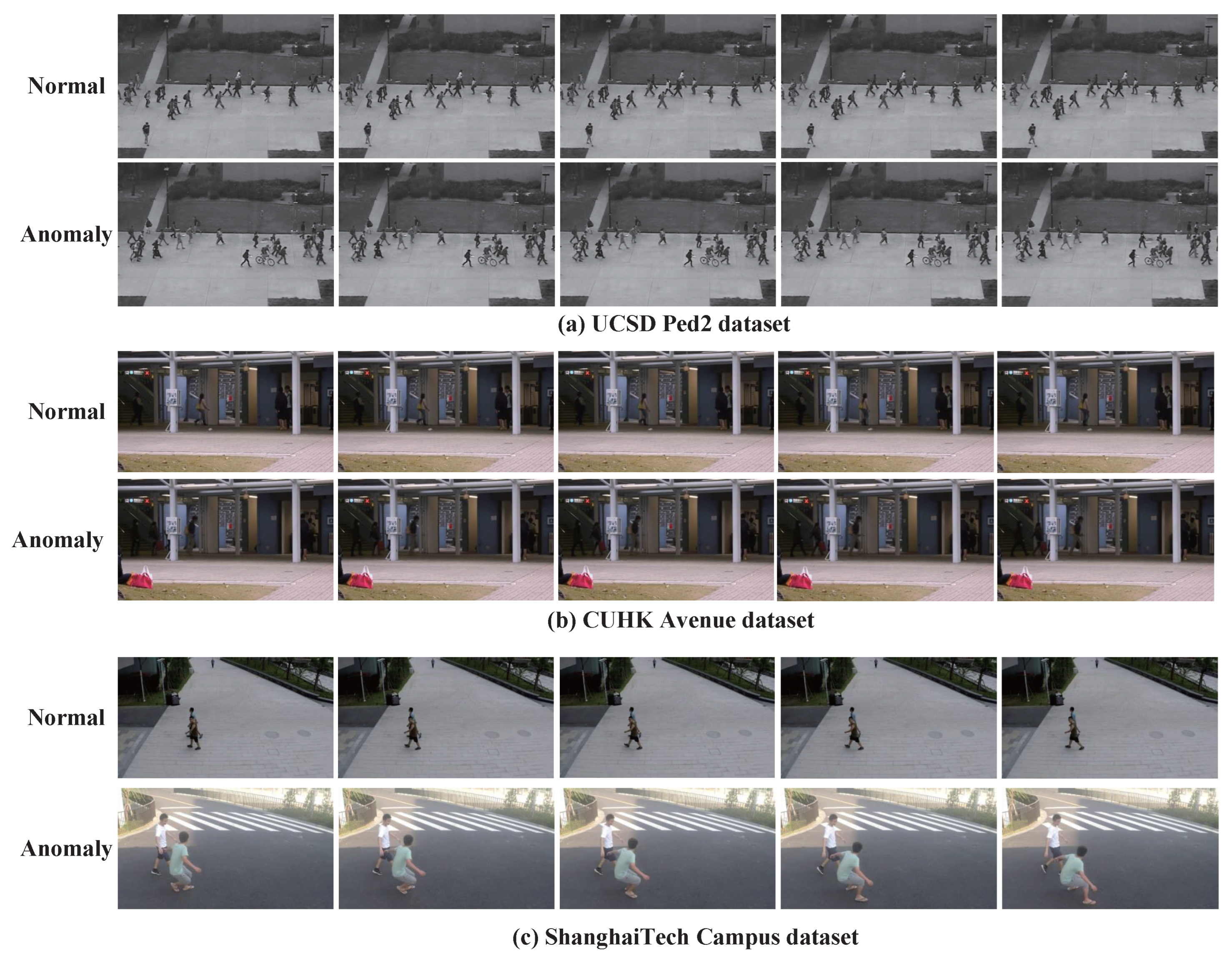 - ShanghaiTech Campus dataset. The ShanghaiTech Campus dataset dataset was created by ShanghaiTech University, featuring footage captured in diverse environments including the university campus, Shanghai streets, and commercial districts. It contains 130 distinct anomaly categories, such as climbing, cycling, and jumping, thereby presenting considerable challenges for video anomaly detection tasks. Figure 6c shows the sample cases of this dataset. The dataset comprises 330 training videos and 107 testing videos. In experiments, the training videos are extracted into 274,515 frames, and the testing videos are extracted into 42,883, all with a resolution of 480 × 856 pixels.
