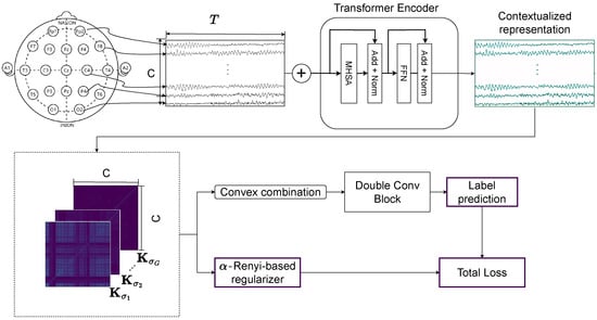 In turn, transformers have recently demonstrated strong performance in EEG analysis due to their ability to capture long-range temporal dependencies and learn attention maps interpretable as channel relevance patterns [37]. Nevertheless, their high modeling capacity also makes them particularly susceptible to overfitting in low-sample, high-variance EEG settings, where they may inadvertently learn subject-specific instead of neurophysiologically meaningful structure [38,39]. Meanwhile, information-theoretic regularization has shown strong potential to promote disentangled and complementary feature learning, particularly through Rényi entropy-based formulations that offer robust sensitivity to higher-order statistical structure [40]. Yet, this powerful mathematical framework remains underexplored in clinical EEG modeling.
