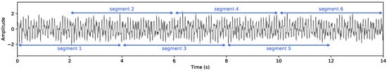 To ensure class balance prior to model training, one ADHD subject was randomly removed from the dataset, resulting in a final sample of 120 participants (60 control and 60 ADHD). After balancing, all subsequent analyses proceeded as described. To minimize preprocessing bias and evaluate the model’s capacity to learn directly from raw electrophysiological structure, EEG signals were fed to the network without artifact removal, filtering, or spectral band decomposition. This design enables the model to operate on minimally processed neural activity, avoiding conventional assumptions about spectral relevance and reducing the risk of discarding physiologically meaningful dynamics. Also, following standard practice in EEG-based classification [19], recordings were segmented into 4 s epochs (512 samples at 128 Hz) with a 50% overlap. Consecutive windows therefore begin every 2 s, yielding dense temporal sampling while preserving temporal independence assumptions (see Figure 4). This segmentation produced the following: Control group: 3657 segments (mean per subject); ADHD group: 4622 segments (mean per subject). Moreover, each epoch was treated as an independent training instance, but subject identity was preserved and never mixed across folds, ensuring strict subject-wise separation in all evaluation pipelines.