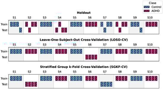 To assess generalization under rigorous subject-independent conditions, two complementary validation schemes were implemented. Figure 5 presents a simplified illustrative example using a hypothetical cohort of 10 subjects, highlighting how Holdout, LOSO-CV, and SGKF-CV differ in the way subjects are split between training and testing. This visualization helps clarify the allocation strategy conceptually, before scaling it to the full cohort of 120 participants used in our experiments.