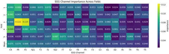 Figure 11 depicts the resulting topographies. The ADHD map (left) shows a frontal midline depression centered on Fz and pronounced posterior relevance with a right-occipital peak around O2, accompanied by contributions in P4/T6 and a secondary lobe near T5. The Control map (middle) exhibits an even deeper valley along the midline (Fz through Cz–Pz) and comparatively elevated lateral activity, yielding a more symmetric peripheral profile. The class-wise difference (right) highlights where the model’s spatial evidence diverges most: the strongest separations occur over fronto-lateral sites (F3/F4) and lateral central electrodes (C3/C4), whereas differences are minimal along the midline axis (Fz–Cz–Pz) and at occipital sites (O1/O2), where both classes show similar levels after joint normalization.
