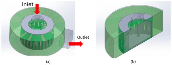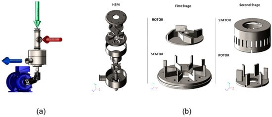 The HSM used to carry out CFD simulations is based on an industrial vertical high-shear mixer composed of two separate RS and feed assemblies. Urea is fed by gravity along the vertical axis. The water is fed using a hydraulic pump in the axial direction. Figure 1a shows the overall 3D design of this equipment. The production process is conducted in two stages. Each stage consists of a rotor–stator assembly. Each of the rotors is fixed to the transmission shaft-driven shaft. This shaft is located in the geometric center of the mixer and connects to the shaft of an electric motor, a motor shaft using two flexible cardan couplings. The 3D geometries of the HSM were developed using SolidWorks® 2022 software and are presented in Figure 1b.