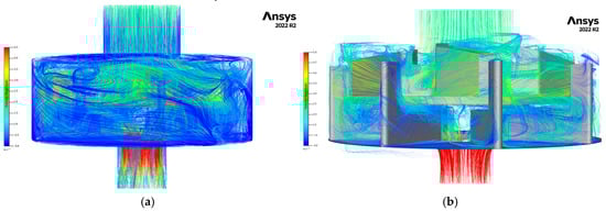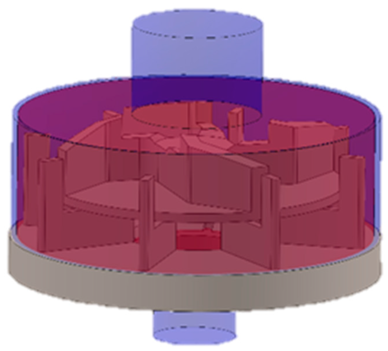 Both geometries were enclosed within static cavities, which define the flow domain boundaries around the agitators/rotors. The first flow boundary of the RS assembly is represented by a red cylinder; this domain corresponds to the internal volume where the fluid is in motion. The total flow domain of the first RS assembly is represented by three vertically stacked cylinders. Each of these cylinders represents, respectively: (i) the inlet region; (ii) the fluid contact with the RS assembly; and (iii) the outlet. Both fluid domains of this RS assembly are intrinsically connected. This relationship is clearly illustrated in Figure 2, which shows the complete domain of the first stage of the HSM.