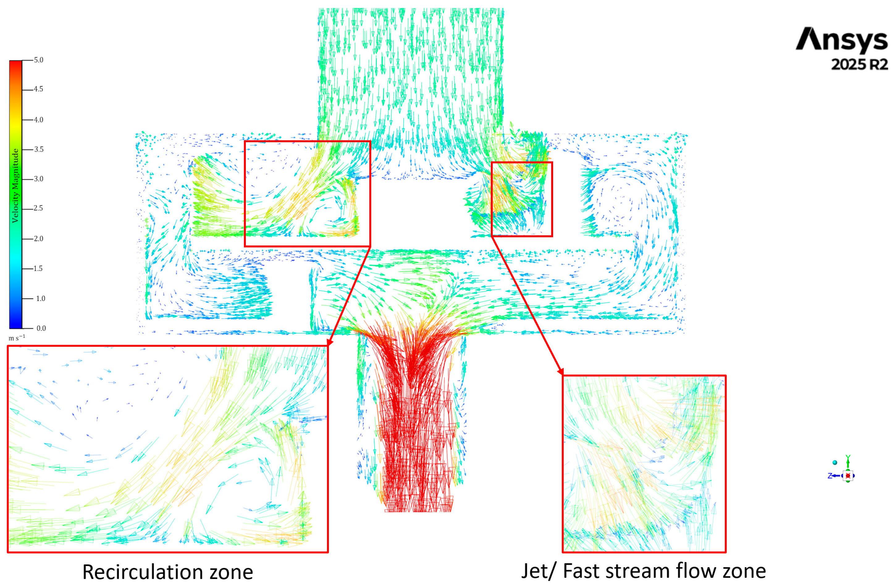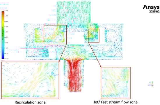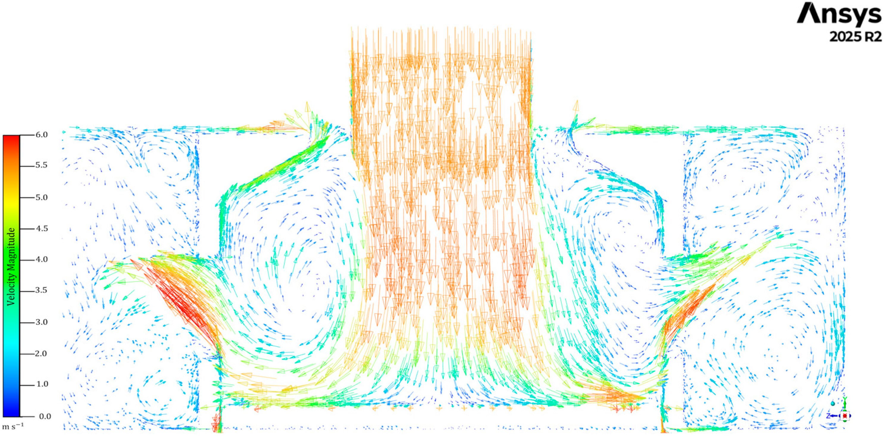 Figure 20. Mixing deceleration zone (velocity vector map) at the outlet in the view of the ZX plane at y = 65 mm.
