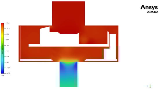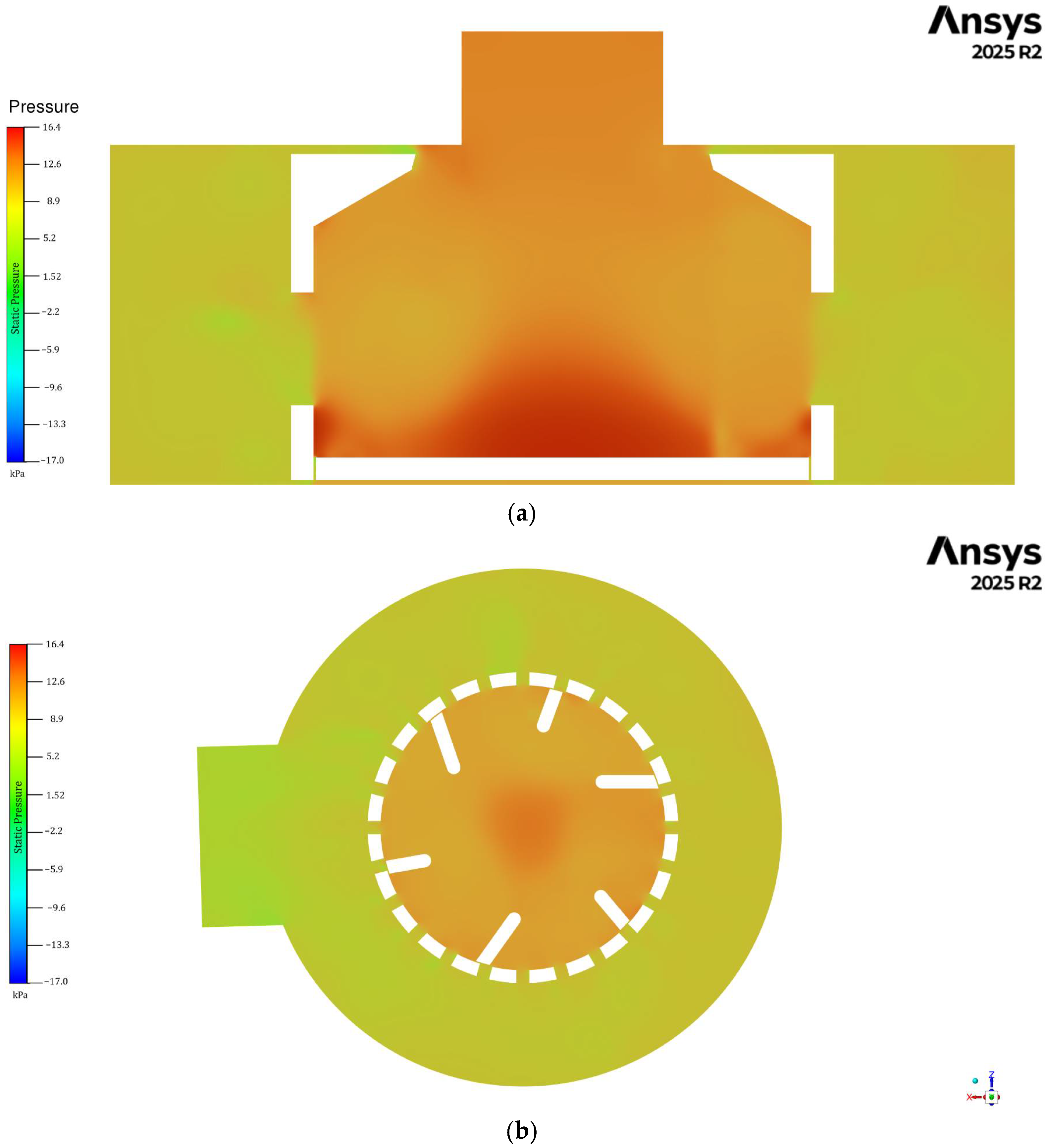Figure 22. Contours of the static pressure of the RS assembly with the casing, shown in a cut view on (a) the YZ plane at x = 34 mm and (b) the ZX plane at y = 65 mm.