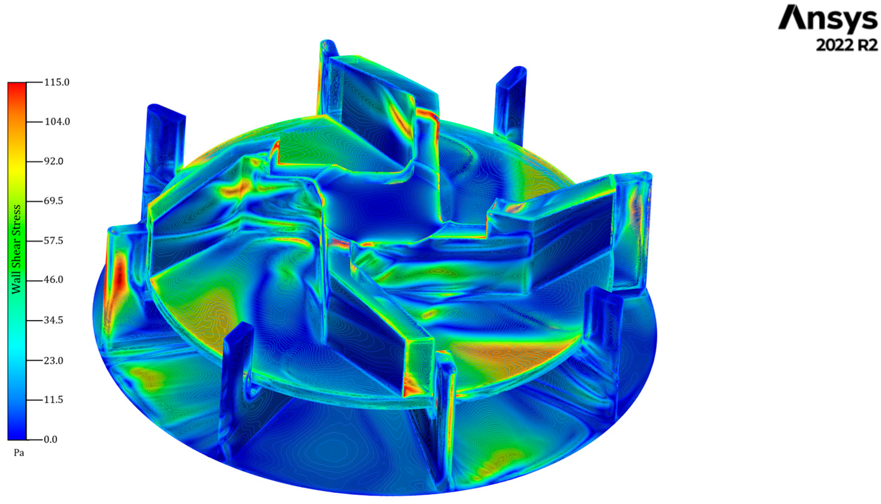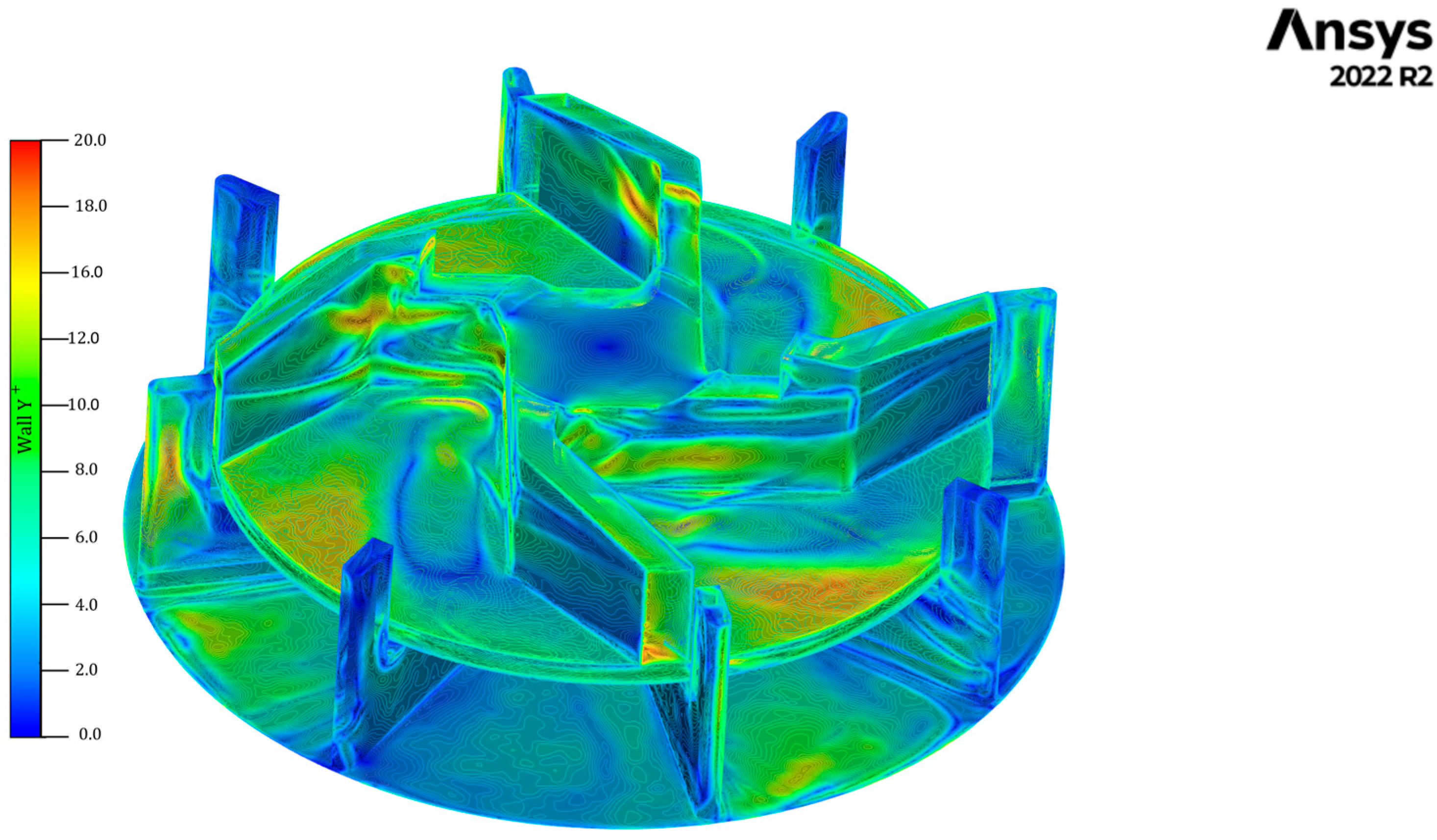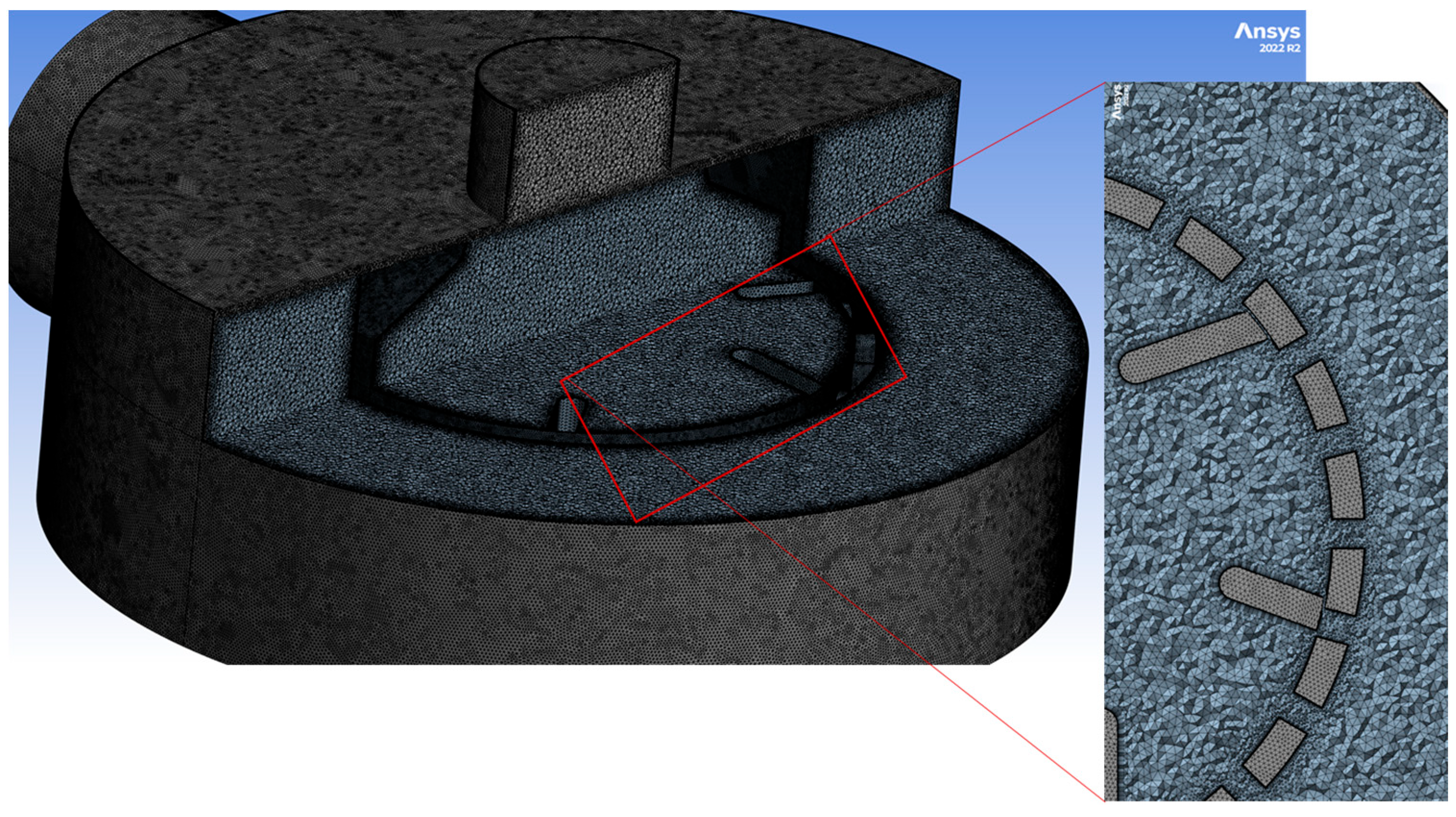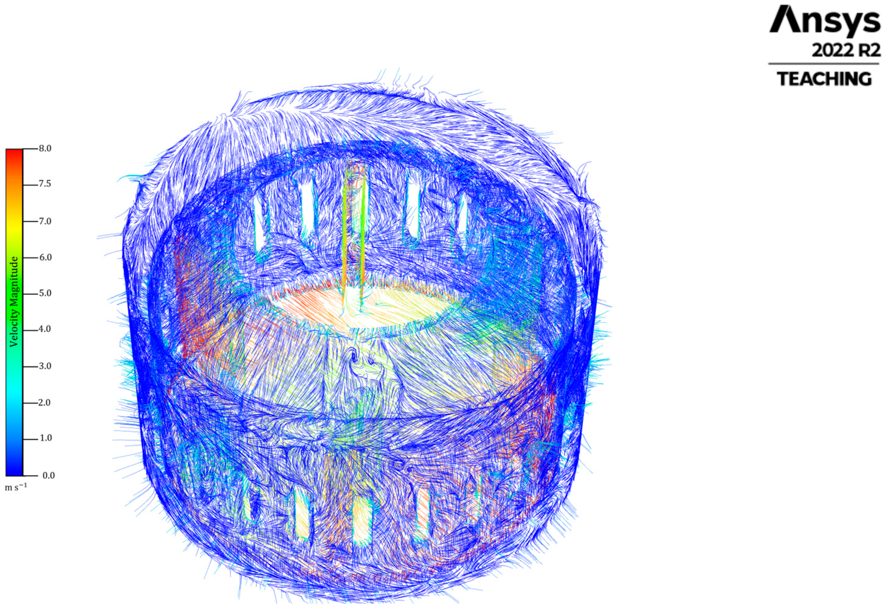 CFD simulations were carried out to investigate the fluid flow characteristics within the domain, incorporating turbulence modelling to capture the effects of rotational motion and wall interactions, using the ANSYS Fluent 2022 R2 solver. The simulations were carried out in a desktop workstation equipped with AMD Ryzen Model, 12 cores, 3.7 GHz and a RAM 4 × 32 GB, DDR4 3600 MHz CL18.