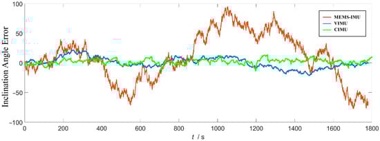 In this experiment, Fiber Optic Gyroscope (FOG) data was used as the true value. FOG is based on the Sagananu effect, and the zero-bias drift and random walk are much smaller than those of MEMS [20]. The attitude calculation results of single MEMS, VIMU and CIMU were compared and the errors were analyzed and compared. Figure 5 shows the inclination angle error calculation results.