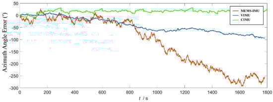 Figure 7 shows the azimuth angle solution results. The azimuth angle error of the single MEMS-IMU solution data fluctuates greatly during the experiment, and is prone to large cumulative errors over time, with a maximum value of up to 293.7′. The stability of the attitude solution results is poor; the attitude solution results of VIMU are more stable and accurate, but the errors are still serious; the CIMU solution results are significantly better than the other two algorithms, with stable solution results and small errors.