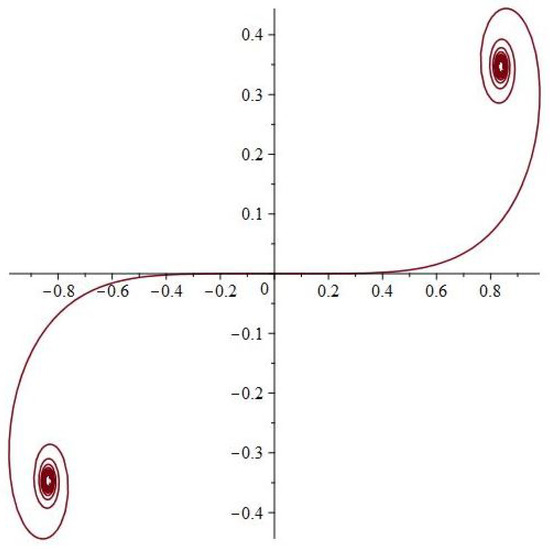 Consider now a curve with (a slightly modified) curvature function ; its graph is very different “locally”, even if it shows a similar asymptotic behavior (see Figure 7). To avoid confusion, we point out that the “third asymptotic limit” from the middle bottom is only apparent; one can easily check it, by magnifying/restricting the graph (for example, by taking ).