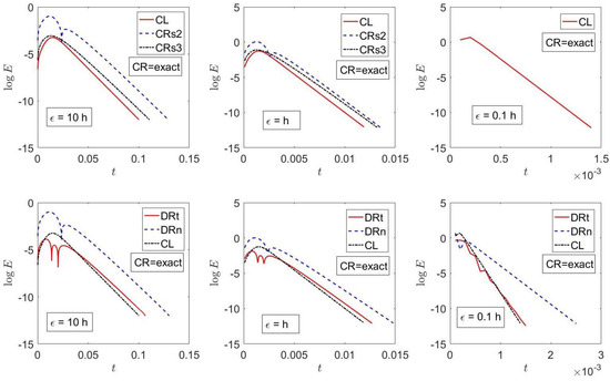 Figure 3 also indicates that, for , CRs3 and CRs4 are more accurate than CRF, and the (absolute value of the) slope of beyond the maximum value of E for CRs2, CRs3 and CRs4 decreases much more slowly with time than that of CL, CLF and CRF.