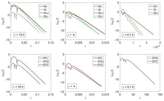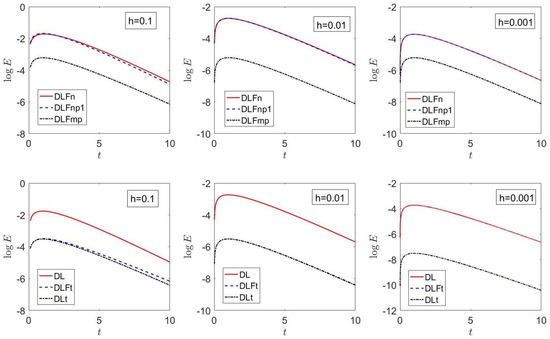 In Figure 2, the errors of the implicit and trapezoidal methods, i.e., Dn and Dt, respectively; linearized implicit and trapezoidal techniques, i.e., DLn and DLt, respectively; and the first-, second- and third-order accurate methods presented in Appendix A, Appendix B and Appendix C, respectively, are reported for , h and .