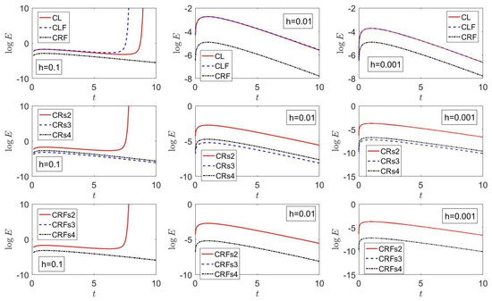 Figure 1 shows the decimal logarithm of which is the error of the method M applied to Equation (63), for , where the subscript stands for exact solution, i.e., Equation (64). Since the right-hand side of Equation (63) is quadratic and does not depend explicitly on t, CR and CRF provide the exact solution, i.e., ; this is not the case for CRs2 and CRs3, which use two and three terms of the series , as discussed previously (cf. Equation (29)).