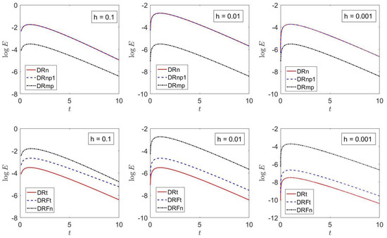 Figure 4 indicates that DRmp is more accurate than DRn and DRnp1; this is in accordance with the fact that, in DRmp, the coefficients are evaluated at the midpoint , whereas they are evaluated at and in DRn and DRnp1, respectively. Figure 4 also shows that DRnp1 is more accurate than DRn.