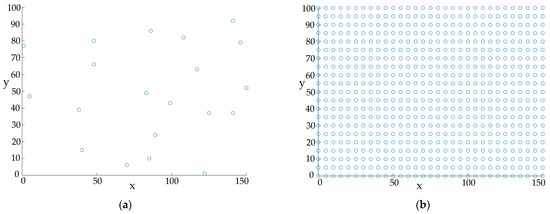 A set of sample points with known property values fi were randomly generated, as shown in Figure 2a. Additionally, 31 × 21 sampling points for the ancillary variable Pj were obtained using uniform sampling with a 5 m interval, as shown in Figure 2b. Their coordinates and ancillary variable values are then substituted into the RBF interpolation formula to calculate P(u). Grid points served as the points to be interpolated, which were compared to the true values.