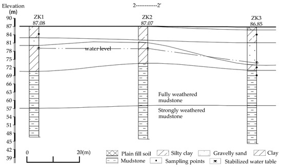 The dataset used for modeling includes 37 boreholes (Figure 5a), 16 engineering geological profiles (Figure 5b), a location map of buildings, and an experimental report of physical and mechanical properties of 41 soil samples. A statistical summary of the properties at the sampling points is presented in Table 1. Five buildings are planned for construction, with exploration completed for buildings 1#, 2#, and 3#, as shown in Table S5. Figure 6 shows an example of an engineering geologic profile 2-2’.
