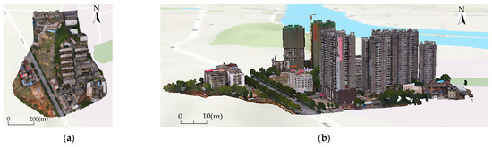 The surface building model is an inclined photogrammetric dataset in OSGB (open scene graph binary) format. Figure 7 shows the surface buildings in the vicinity of the site. The total planned land area is 18,306.1 m2, and the total building area is 95,211.6 m2.