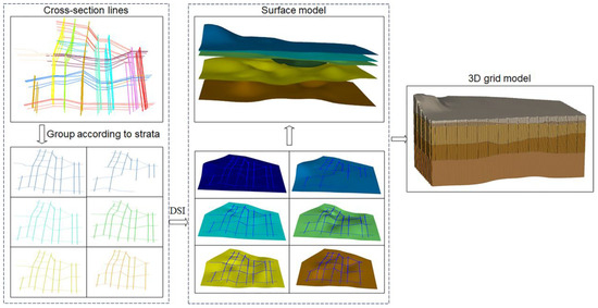 Geological profiles combine original engineering geological investigation data with expert interpretation, making them suitable for the 3D modeling of stratigraphic contact surfaces. In this study, the 16 profiles interpreted by engineer geologists were processed to obtain a series of stratum boundaries. These boundaries were then stitched up according to the strata. Subsequently, the surface model with the stratigraphic undulation pattern was constructed based on the DSI algorithm. Finally, the boundaries were stitched together to generate a solid model. The 3D geological structure modelling process is shown in Figure 8. The volume and average thickness of each stratum were calculated, as shown in Table 2.