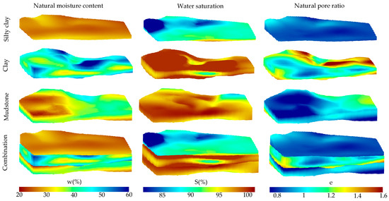 The solid model was gridded into cells with size of 1 m × 1 m × 0.2 m, where the cell properties were filled with the values at the cell center. Three properties, i.e., natural pore ratio, natural moisture content, and water saturation, were selected for modeling according to the experimental report of physical and mechanical properties of soil samples. The SPF values of the stratum surfaces were set to 10, 20, 30, 40, and 50 from top to bottom. The SPF values at points between the stratum surfaces were obtained using the IDW interpolation method (Figure 10). The SPF model was uniformly sampled under the structural constraints of the strata and used as a covariate to assist in the main variable interpolation. The MRBF method was applied to interpolate the properties of the entire model. Since the properties vary across different strata while being similar within the same stratum, the interpolation was conducted under the constraints of the stratum. Specifically, the interpolation was performed separately for the silty clay, clay, and mudstone strata. The interpolation results are visualized in Figure 11, and the histogram illustrates the distribution of the properties values of each stratum, as shown in Figure 12. The distributions of natural moisture content and natural pore ratio are closer to normal, especially for clay and mudstone, which exhibit low skewness (<0.3) and relatively symmetric shapes. In contrast, silty clay shows a slight right skew. On the other hand, water saturation significantly deviates from normality, exhibiting high negative skewness (<−1) with sharp peaks and long left tails, particularly in silty clay and clay. This suggests that water saturation is likely constrained by boundary conditions (i.e., an upper limit of 100%), whereas natural pore ratio and moisture content are influenced by more random processes, resulting in distributions that are closer to a Gaussian shape. The distribution of the moisture content and pore ratio revealing a similar pattern, suggesting a possible correlation between them.