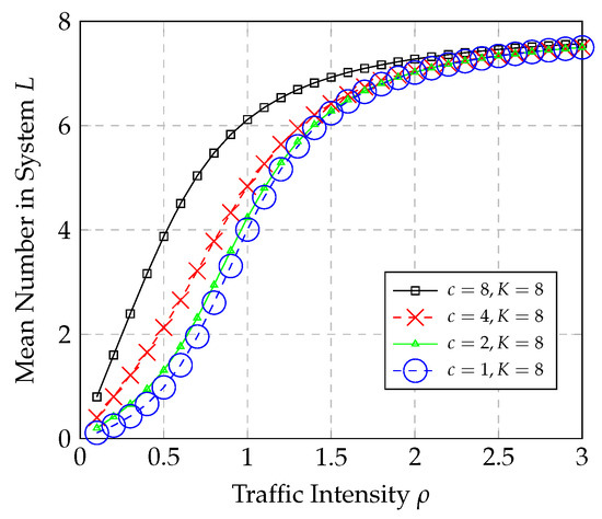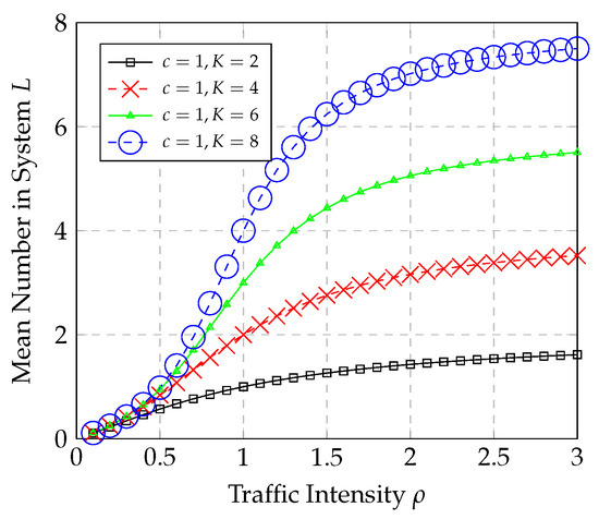 The graphs in Figure 2 show the results of the mean number of items in the M/M/1/K system for varying traffic intensity (with and ), and for a system capacity of . Furthermore, the graphs in Figure 3 show the results of the mean number in the system for an M/M/c/K system for varying (with ) and with varying number of servers . For this M/M/c/K system, the graph of L for a large shows the same pattern as that for the M/M/1/K for a large K.