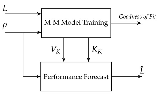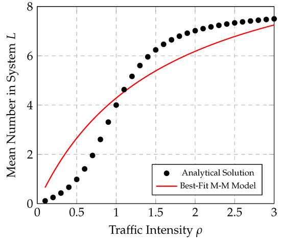 Our proposed solution is based on non-linear regression of two parameters and utilizes standard techniques for evaluating the best-fit parameters for the Michaelis–Menten model. In general, such computations are significantly less complex and require very short computational run times when compared with simulations. For example, the simulation of the system in Figure 18 had an average runtime of 167 s for each variation in the traffic intensity, whereas the parameter fitting computations were completed in under 1 s. Furthermore, our proposed solution is independent of the system’s complexity and avoids the need to develop complex simulations. In addition, once the best-fit parameters are evaluated using the data from the system, the result can be used to immediately predict the mean number in the system L for any traffic intensity (or arrival rate ). Meanwhile, a simulation would typically require more computational time and resources, and would need to be repeated for different values of (or ). Thus, the computation time and computational complexity of the proposed solution are negligible when compared with the method of evaluating the system’s performance using simulations.