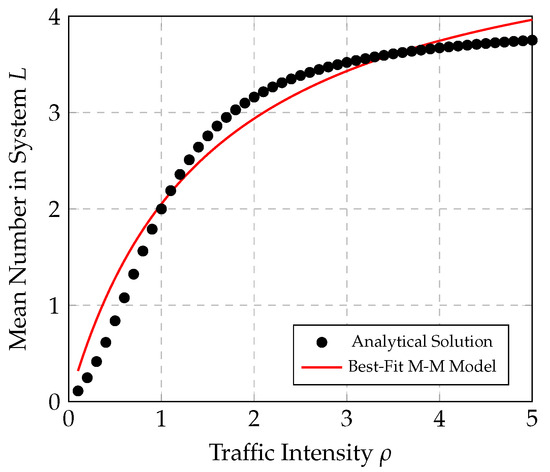 Table 1 shows the values of the coefficients and that were computed for the M-M model that best fit the results that were evaluated for the mean number L in the M/M/1/K systems shown in Figure 2. For determining the best-fit model, we included additional results from the analytical solutions for up to to determine the coefficients of the M-M model. The table also includes the value for the coefficient of determination , which provides a measure for the goodness-of-fit.
