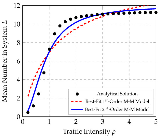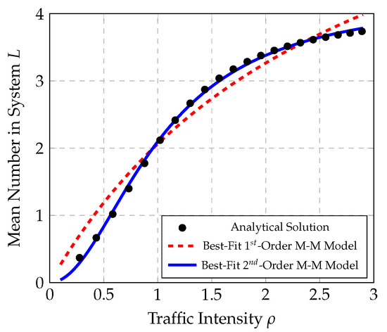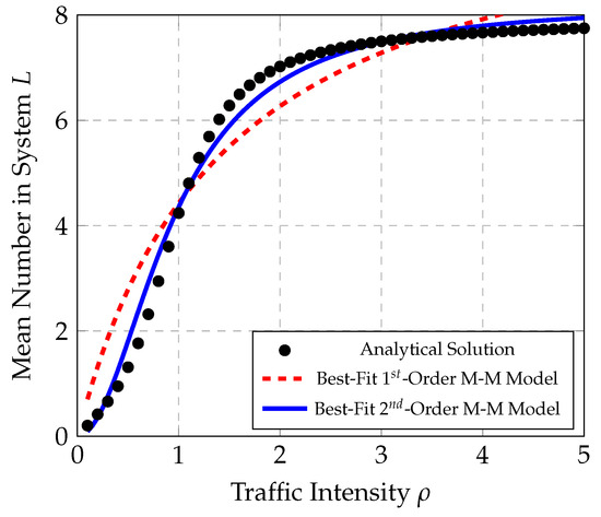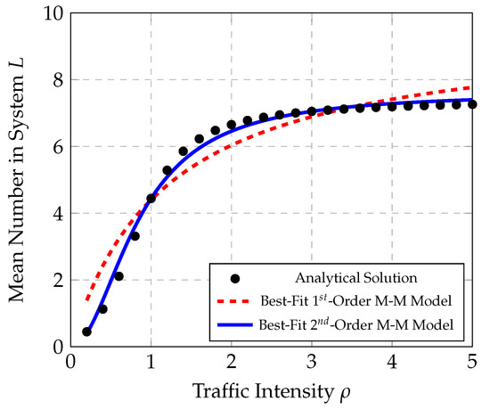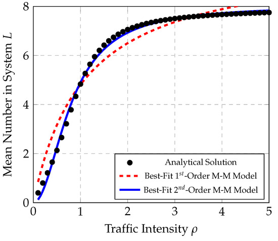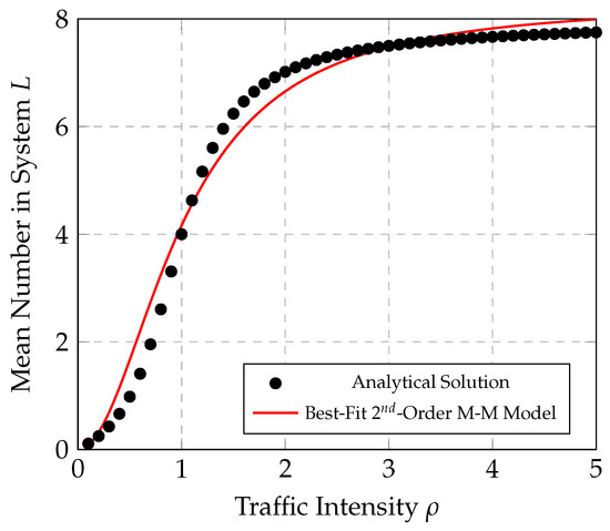 Table 2 shows the values of the coefficients for the second-order M-M model that provided the best fit for the mean number L in the same M/M/1/K systems shown in Figure 2. These results show an overall higher goodness-of-fit . These improvements are further demonstrated by the results shown in Figure 7 and Figure 8 that compare the best-fit second-order M-M model with the analytical results for the mean number in the M/M/1/4 and M/M/1/8 systems, respectively. Note how these results show that the second-order M-M model yielded a better fit compared to the ones shown in Figure 5 and Figure 6.